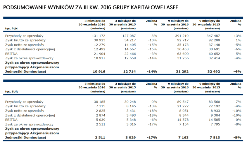 Rentowność operacyjna Grupy ASEE na koniec trzeciego kwartału 2016 roku osiągnęła poziom 9,3%.