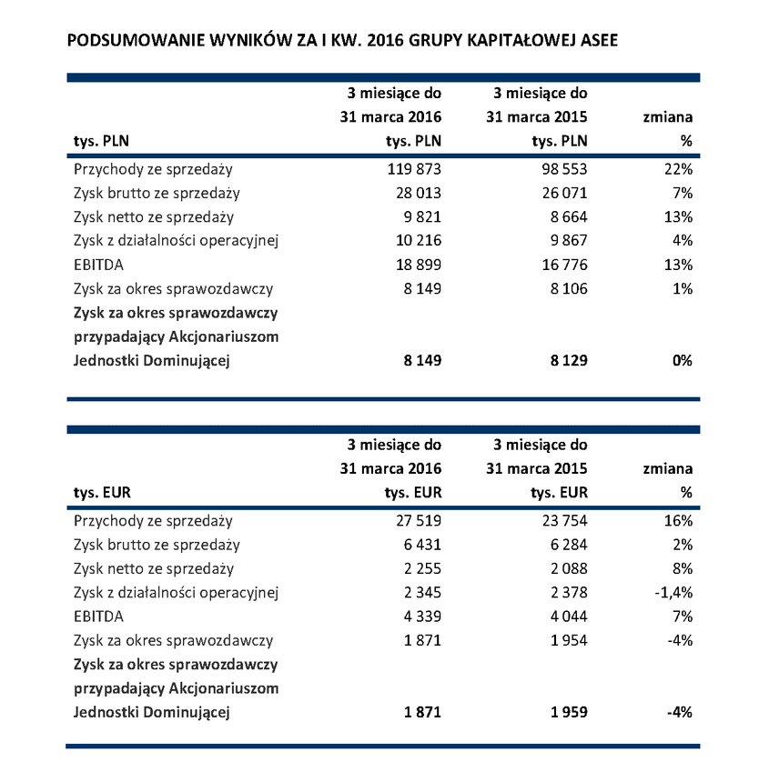 Rentowność operacyjna Grupy ASEE na koniec pierwszego kwartału 2016 roku była na poziomie 8,5%.