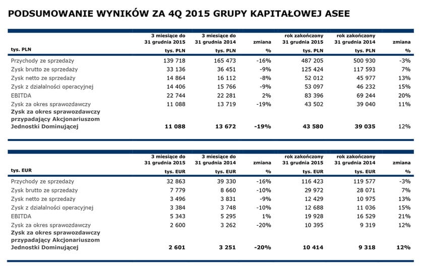 Rentowność operacyjna Grupy ASEE na koniec 2015 roku była na poziomie 10,9%, co stanowi wzrost o 1,7 p.p. w porównaniu z analogicznym okresem w ubiegłym roku.