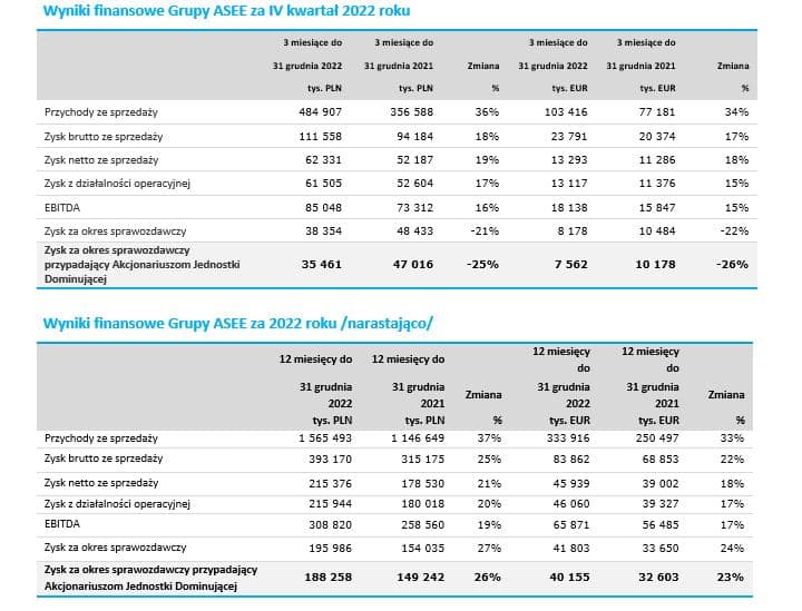 Warszawa, 23 lutego 2023 r.: Grupa ASEE, (GPW: ASEECOSEE, ASE) opublikowała wyniki finansowe za IV kwartał i za cały 2022 rok, w którym spółka osiągnęła przychody ze sprzedaży na poziomie 103,4 mln EUR na koniec IV kwartału i 333,9 mln EUR na koniec całego 2022 roku, co oznacza wzrost odpowiednio o 34% i 33% w stosunku do porównywalnych okresów 2021 roku.