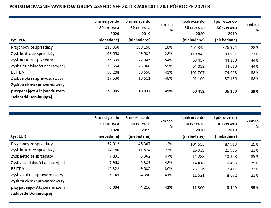 Przychody ze sprzedaży Grupy Asseco SEE za pierwsze półrocze 2020 roku wyniosły 104,6 mln EUR, co oznacza wzrost o 16,7 mln EUR (19%) w stosunku do analogicznego okresu ubiegłego roku. Wzrost sprzedaży odnotowano we wszystkich segmentach działalności spółki, na czele z segmentem Rozwiązania w obszarze płatności. Zysk z działalności operacyjnej Grupy ASEE w pierwszym półroczu 2020 roku wyniósł 14,4 mln EUR, rosnąc o 4 mln EUR (39%). Marża zysku operacyjnego wzrosła z 11,8% po pierwszych sześciu miesiącach roku poprzedniego do poziomu 13,8% na koniec pierwszego półrocza bieżącego roku. Zysk netto za pierwsze półrocze 2020 roku wyniósł 11,5 mln EUR, po wzroście o 33% w porównaniu do analogicznego okresu ubiegłego roku. Wartość portfela zamówień spółki na 2020 rok wynosi 201,2 mln EUR i jest o 19% wyższa niż w 2019 roku.