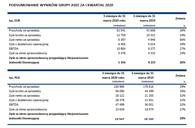 Zysk z działalności operacyjnej Grupy ASEE w pierwszym kwartale 2020 roku wzrósł o 1,4 mln EUR (29%) i wyniósł 6,5 mln EUR. Marża zysku operacyjnego wzrosła z 12,1% w pierwszych trzech miesiącach roku poprzedniego do poziomu 12,3% na koniec pierwszego kwartału 2020 roku. Grupa ASEE wypracowała 5,4 mln EUR zysku netto za pierwszy kwartał, co oznacza wzrost o 24% w porównaniu do pierwszych trzech miesięcy 2019 roku.