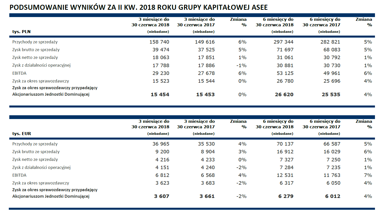 Rentowność operacyjna Grupy ASEE w pierwszym półroczu 2018 roku osiągnęła poziom 10%. Z kolei skonsolidowany zysk netto spółki po 6 miesiącach 2018 roku wyniósł 6,3 mln EUR i był wyższy o 4% w stosunku do analogicznego okresu ubiegłego roku. Księga zamówień (backlog) na 2018 rok osiągnęła 124,4 mln EUR i jest o 10% wyższa niż w poprzednim roku.