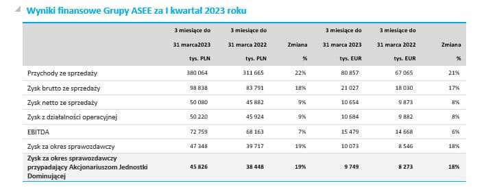 Warszawa, 28 kwietnia 2022 r.: Grupa ASEE (GPW: ASEECOSEE, ASE) opublikowała wyniki finansowe za I kwartał 2023 roku, w którym spółka osiągnęła przychody ze sprzedaży na poziomie 80,9 mln EUR, co oznacza wzrost o 21 % (13,8 mln EUR) w stosunku do I kwartału ubiegłego roku.