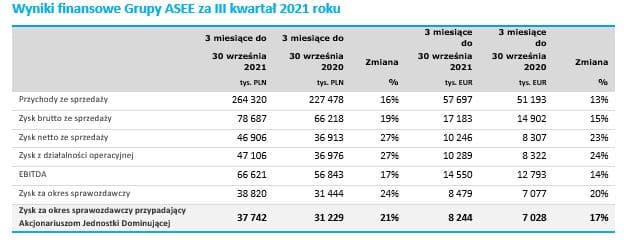 Skonsolidowany zysk netto Grupy ASEE za trzeci kwartał 2021 roku wyniósł 8,5 mln EUR, co oznacza wzrost o 20% w stosunku do trzeciego kwartału ubiegłego roku. Księga zamówień (backlog) na 2021 rok całej Grupy ASEE, liczona w przychodach ze sprzedaży, osiągnęła 231,8 mln EUR, czyli o 9% więcej niż w porównywalnym okresie ubiegłego roku.