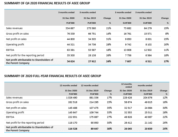 – 2020 was another best year in the history of ASEE Group despite global Covid-19 pandemic. Sales revenues were up 12%, operating profit up 28% and EBIDTA up 22%. Such a considerable improvement of financial results, compared with the previous year, was possible thanks to a substantial improvement in the efficiency of Banking and Dedicated Solutions business units as well as an increased scale of operations of the Payment business unit (Payten). In Payten the biggest sales revenues growth was generated by the POS related services business line. Sales revenues also grew in the ATM related services and e-Commerce business lines with the latter being influenced by the global pandemic. At ASEE sales revenues growth was achieved by mobile and omnichannel banking solutions. Moreover in this unusual year we observed an increased interest of the clients in the solutions for remote communication, remote document management as well as solutions enabling to handle problems connected with pandemic. – commented Piotr Jeleński, President of the Management Board of Asseco South Eastern Europe S.A.