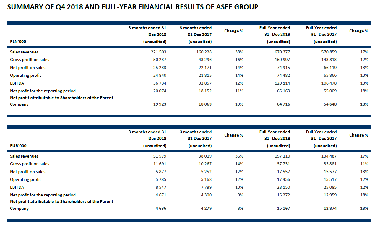 I am pleased with the best financial results in the history of the ASEE Group, including Payten, generated at the end of 2018. The fourth quarter was a record quarter for us as well with a 36% sales revenues growth mainly thanks to Payten and Systems Integration business unit but also due to interesting new projects in the Banking business unit. I believe that the purchase of Necomplus in Q1 2019 and thus entering Spanish language markets, new for Payten, as well as other planned acquisitions, will increase our international expansion and reinforce our position and expertise on the payments market. Additionally, offering innovative solutions within banking will enable us to continue to be an attractive partner for the banks in their digital transformation. – commented Piotr Jeleński, President of the Management Board of Asseco South Eastern Europe S.A.
