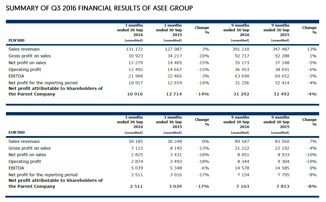 The ASEE Group’s net profit for the three quarters of 2016 totaled EUR 7.2 million and was lower by 8% compared with the three quarters of 2015.