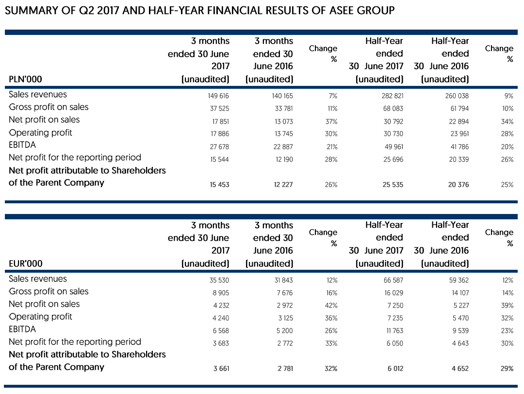 Operating profitability of ASEE Group in the first half of 2017 reached 11%. Whereas net profit after 6 months of 2017 totaled EUR 6 million, up 30% compared with the same period of the last year. The company announced backlog value for 2017 amounting to EUR 112.9 million, up 4% compared with 2016.
