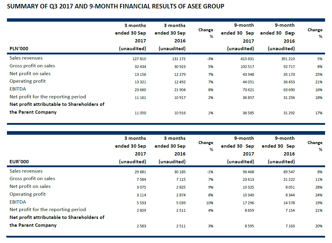Operating profitability of ASEE Group after the first nine months of 2017 reached 10.7%. Whereas net profit after three quarters of 2017 totaled EUR 8.7 million, up 21% compared with the same period of the last year. The company announced backlog value for 2017 amounting to EUR 125 million which is at the same level as in 2016.