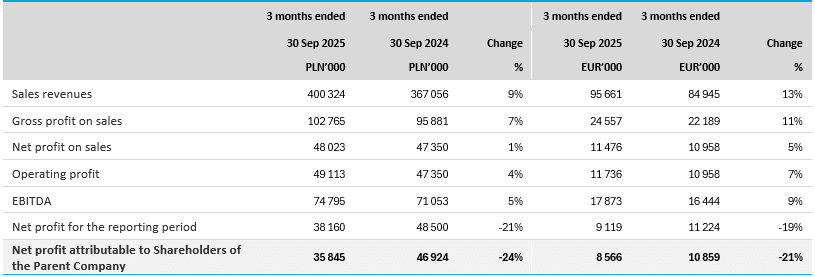 Warsaw, 24 October 2025: The ASEE Group (WSE: ASEECOSEE, ASE) has published its financial results for the third quarter of 2025, in which the company achieved sales revenues, adjusted for the impact of one-off transactions*, of EUR 105.5 million, representing a 2% increase compared to the corresponding period of 2024.