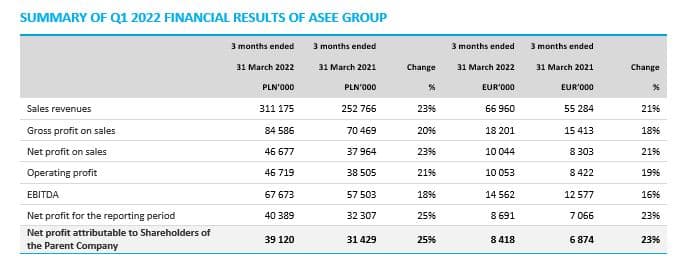 Consolidated net profit of ASEE Group in Q1 2022 amounted to EUR 8.7 million, up EUR 1.6 million (23%), compared with a corresponding period of the previous year.