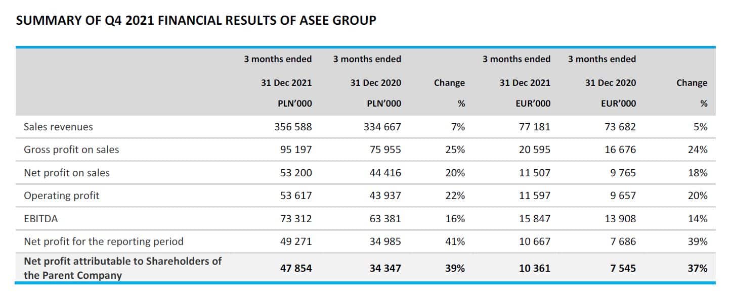Consolidated net profit of ASEE Group in Q4 2021 amounted to EUR 10.6 million, up EUR 3 million (39%) compared with a corresponding period of the previous year, and for the whole 2021 it amounted to EUR 33.9 million, up 29% (EUR 7.6 million).