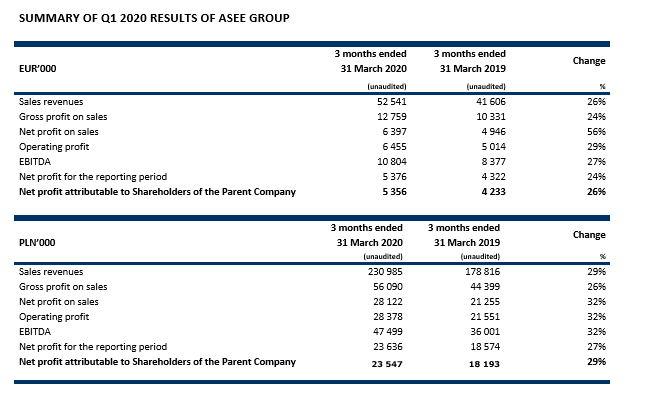 Revenues of ASEE Group in the first quarter of 2020 totaled EUR 52.5 million, up 26% compared with the corresponding period of the last year. Sales growth was recorded by all business units of the company. With the revenue of EUR 25 million, Payment business unit generated increase by EUR 7.2 million. The biggest growth (by EUR 5.5 million) was generated by the POS maintenance services business line, which matches the trend in the corresponding period last year. Sales revenues in the Banking business unit totaled EUR 9.3 million, with the business lines for mobile solutions as well as core banking and other software recording slightly higher revenues. The revenues growth of 18.7% was generated by Dedicated Solutions business unit amounting to EUR 18.2 million. Bigger sales revenues were recorded in infrastructure and third-party solutions as well as integration services.