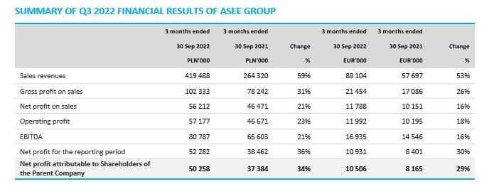 Consolidated net profit of ASEE Group in Q3 2022 amounted to almost EUR 11 million, up EUR 2.5 million (30%), compared with a corresponding period of the previous year.