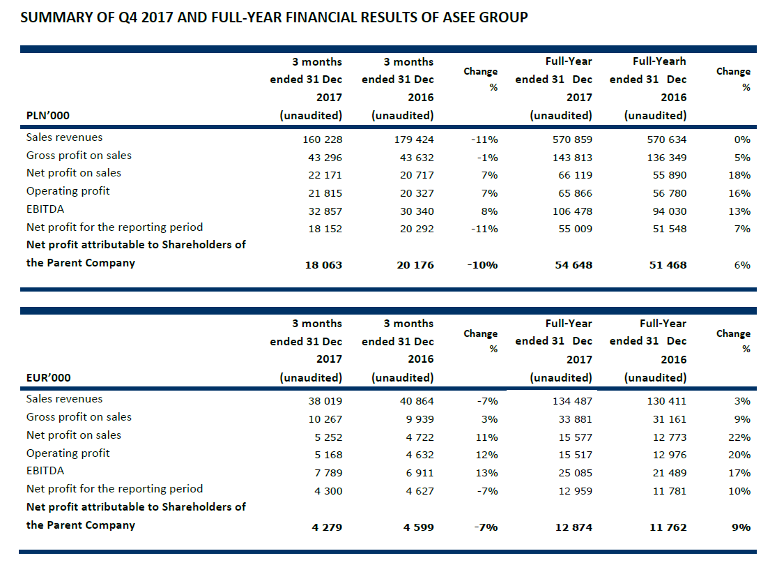 Operating profitability of ASEE Group after twelve months of 2017 reached 11.5%. Whereas full-year 2017 net profit totaled EUR 13 million, up 10% compared with the same period of the last year. The company announced backlog value for 2018 amounting to EUR 95.1 million, up 20% compared with the same period of the last year.