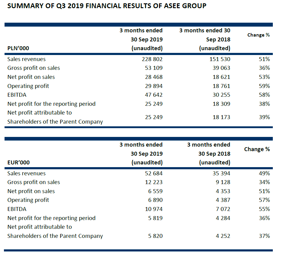 Sales revenues of Asseco SEE Group in the third quarter of 2019 amounted to EUR 52.7 million, up EUR 17.3 million (49%) compared with the same period of the previous year. Third-quarter 2019 operating profit of the ASEE Group amounted to EUR 6.9 million, up 57% (up EUR 2.5 million) compared to the third quarter of the previous year. EBITDA reached EUR 11 million, up 55% (EUR 3.9 million) whereas net profit totaled EUR 5.8 million, up 36% (EUR 1.5 million) compared with the same period of the last year. The company announced backlog value for Q4 2019 according to revenues amounting to EUR 49.9 million, up 45%, compared with Q4 2018, whereas according to Margin 1 to EUR 33.7 million, up 45% too.
